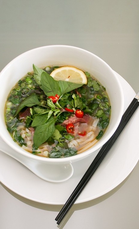 Ladle the boiling stock over the top, sprinkle over the spring onion (scallion) and onion slides and serve.